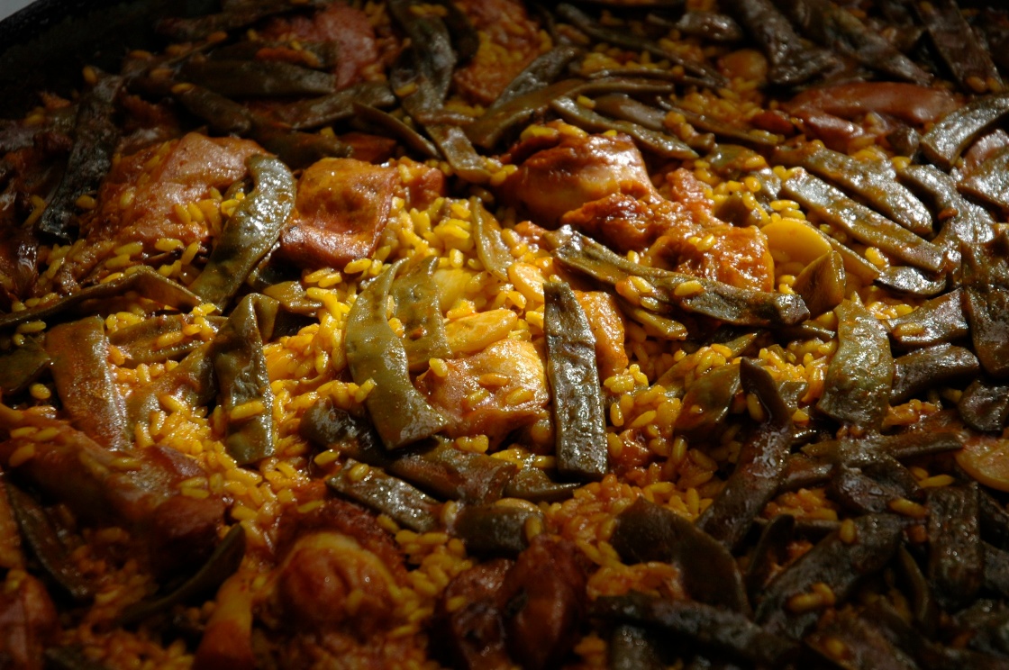 Una vez el aceite esté bien caliente, echaremos el pollo y el conejo a los que habremos puesto sal (si no se ha utilizado el truco descrito anteriormente) e iremos dorándolos lentamente dándoles la vuelta. Generalmente los trozos más grandes se dejan en el interior de la paella, retirando los de menor tamaño hacia los extremos para evitar que se quemen. Repetir una vez más, que es muy importante dorar muy bien toda la carne a fuego suave y sin prisas, que esté todo bien frito. Ahí radica parte del secreto de una buena paella.